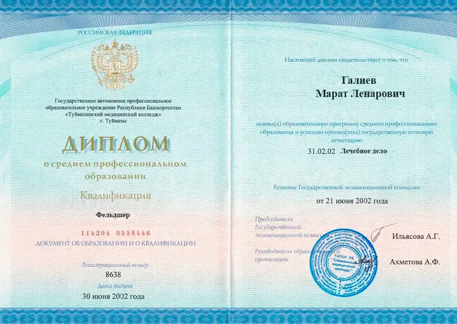 • 2002 —  ГА ПОУ Республики Башкортостан "Туймазийнский медицинский колледж" – диплом фельдшера по специальности "лечебное дело"