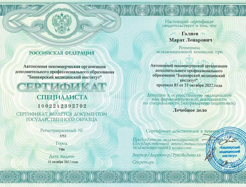 • 2022 — АНО ДПО "Башкирский медицинский институт" – повышение квалификации по специальности "лечебное дело"