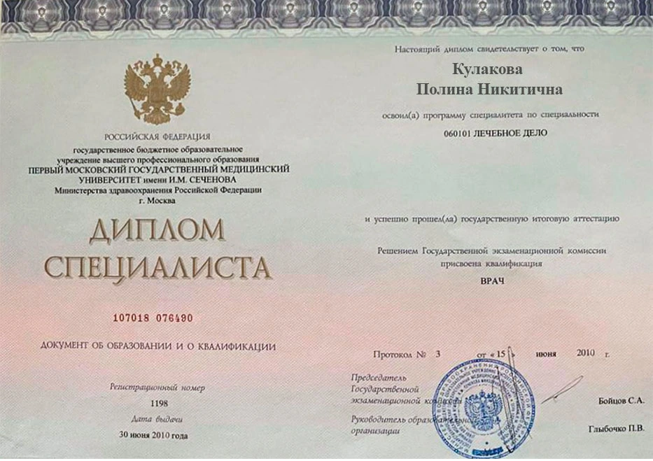 • 2010 — Первый Московский государственный медицинский университет имени И.М. Сеченова (лечебное дело)