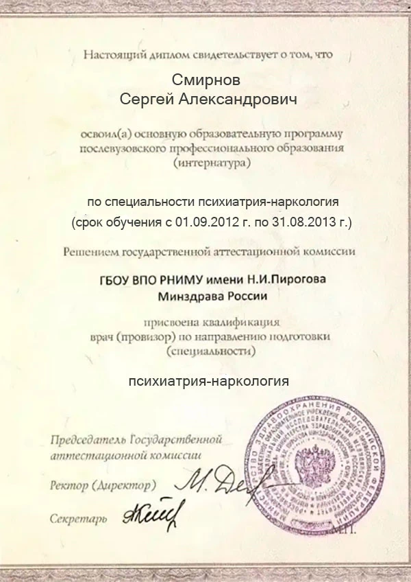 • 2013 г. — Интернатура: ГБОУ ВПО РНИМУ имени Н.И. Пирогова Минздрава России (психиатрия-наркология);